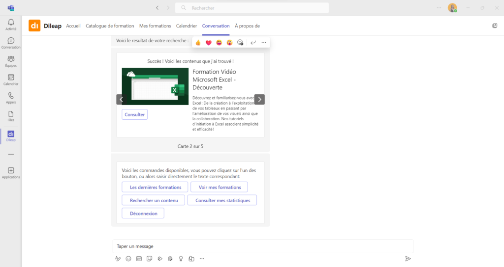 Intégré nativement à l’application, le chatbot permet à vos utilisateurs de trouver facilement et rapidement le contenu de formation qu’ils recherchent.